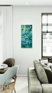 Durch teilweise starke, mit dem Spachtelmesser aufgetragene Strukturen und das gezielte Abkratzen erhält das Werk Tiefe und auf den zweiten Blick eine gewisse Wildheit und Unwägbarkeit. Es wurde in mehreren Farb- und Strukturschichten aufgebaut, die Fertigstellung zog sich über mehrere Wochen.