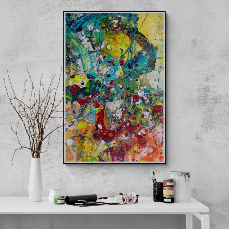 In meinem Kunstwerk Energy verschmelzen Acryl und Lack zu einer abstrakten Explosion der Vitalität. Es ist ein Spiel aus lebendigen Farben und dynamischen Formen, das Energie, Bewegung und Lebendigkeit erzeugt.