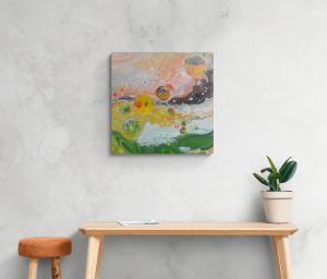 Die bunten Kreise erinnern an Planeten oder frei schwebende Sphären, die in einem leuchtenden Raum zu tanzen scheinen. Sie strahlen Leichtigkeit, Bewegung und zugleich Ruhe aus – ein Spiel zwischen Nähe und Ferne, das die Fantasie anregt und zum Träumen einlädt.