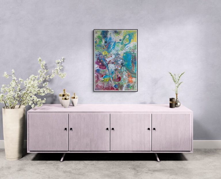 Es ist ein Spiel aus lebendigen Farben und dynamischen Formen, das Energie, Bewegung und Lebendigkeit erzeugt. Jeder Farbtupfer ist gefüllt mit Emotionen, um ein kraftvolles visuelles Erlebnis zu schaffen, das die Sinne belebt und inspiriert.