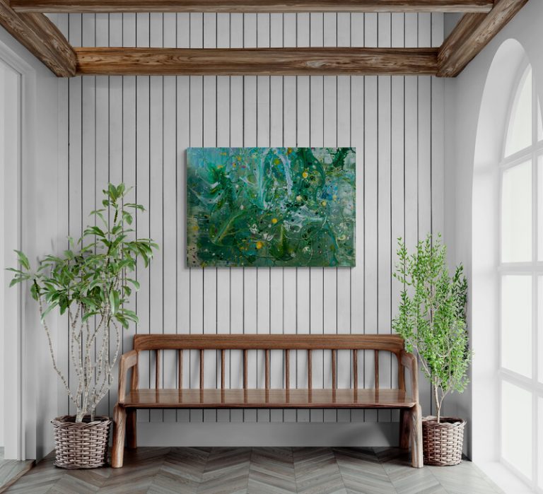 Die Betrachtenden tauchen in eine traumhafte, imaginäre Wasserlandschaft ein. Durch den geschwungenen Farbauftrag erhält das Wasser seine Lebendigkeit und wirkt bewegt, während die weißen Akzente die Szene mit faszinierenden Lichtspiegelungen erhellen.