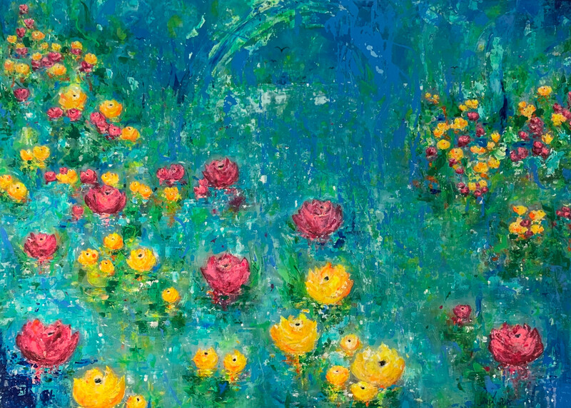 Wasserpoesie im Blütentanz – 100 x 140 cm – Acryl/Öl mit Strukturen auf Leinwand – Sandra Lederer 2025